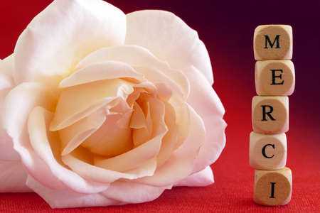 message Merci, french word, which means thanks, written in wooden blocks, pastel rose, red background