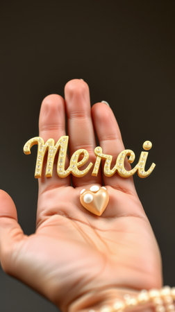 Hand holding shiny merci sign and small heart symbol with a decorative touch in a soft light setting