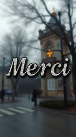 Merci sign illuminated on building in foggy street during winter evening in a quiet town