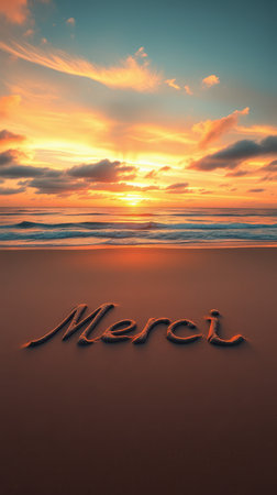 Beautiful sunset over the ocean with handwritten merci in the sand on a tranquil beach