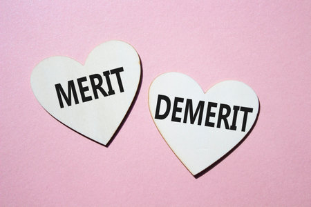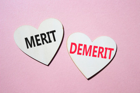 Merit or Demerit symbol. Concept word Merit or Demerit on wooden hearts. Beautiful pink background. Business and Merit or Demerit concept. Copy space