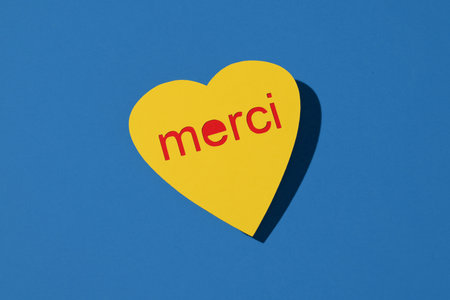 closeup of a yellow heart-shaped sign that reads thank you in french, on a blue background