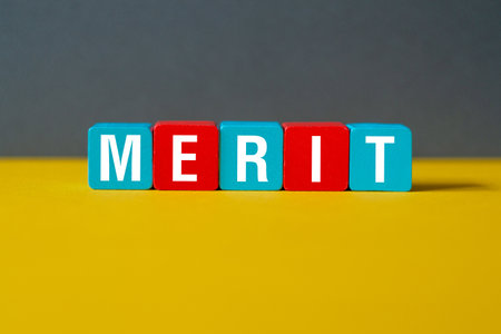 letters of the alphabet with the word merit. the concept of being excellent or worthy, especially so as to receive praise or reward.