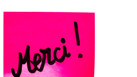 Merci, French thank you words letter, written on piece of memo paper. Motivational business typography quotes concept