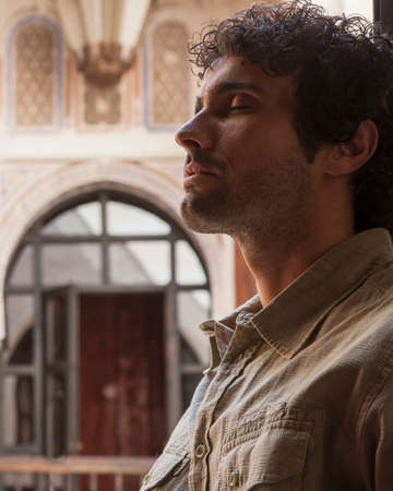 Portrait of young man, eyes closed, Marrakesh, Morocco