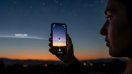 Woman holding a smartphone displaying a celestial object identification app at twilight Clear det...