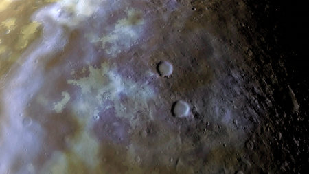 A breathtaking view of a moon's surface, pockmarked with craters, under the soft glow of a distant planet. The scene evokes a sense of tranquility and cosmic wonder.