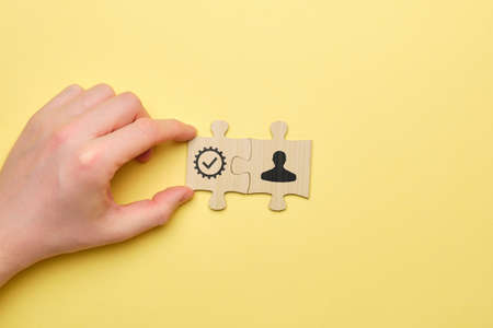 Closeup hands of man connecting jigsaw puzzle. Two hands trying to connect couple puzzle with yellow background. Hand connecting jigsaw puzzle. Man hands connecting couple puzzle piece
