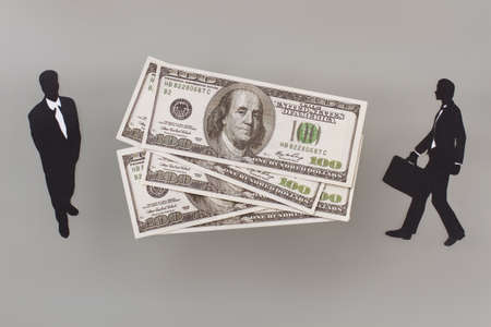 Dollars and two paper figures of businessmen. Financial affairs between partners. Business relations concept.