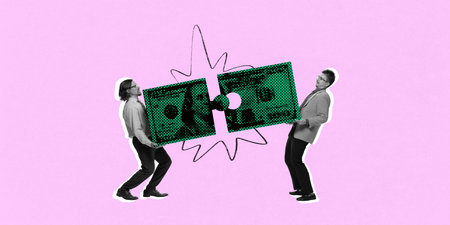 Conceptual artwork. Two businessmen, in black and white, collaborate to assemble puzzle pieces forming dollar bill. Concept of business, cooperation, partnership, financial success, teamwork. Ad