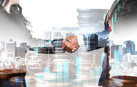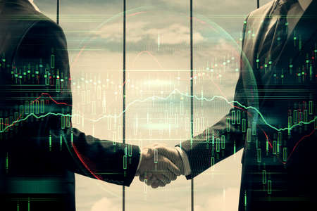 Double exposure of forex graph hologram and handshake of two men. Stock market concept.