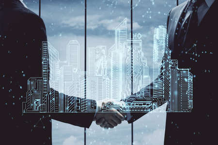 Double exposure of city drawing hologram and handshake of two men. Construction management.