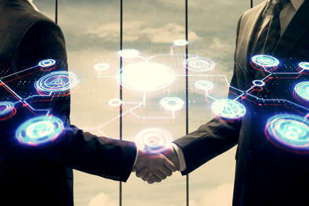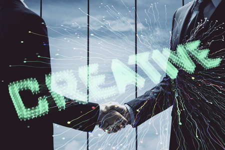 Multi exposure of creative drawing hologram and handshake of two men. Start up concept