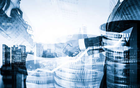 Double exposure,Businessmen are handshake agree to join the business.Business success concept.