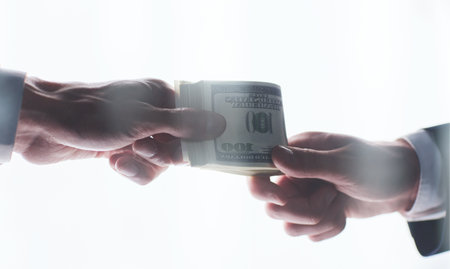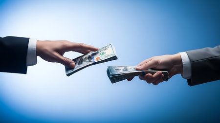 Business people exchanging us dollar banknotes depict finance deal, trade, investment, money exchange, transaction for banking and commerce success.