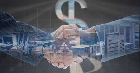 Composition of businessmen shaking hands with american dollar symbol and cityscape. global finance, business and connection concept digitally generated image.