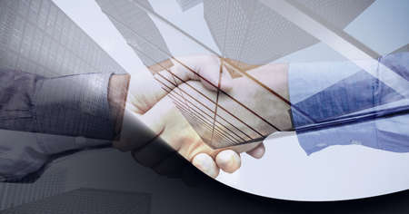 Abstract technology background over two businessmen shaking hands against tall buildings. global business and technology concept