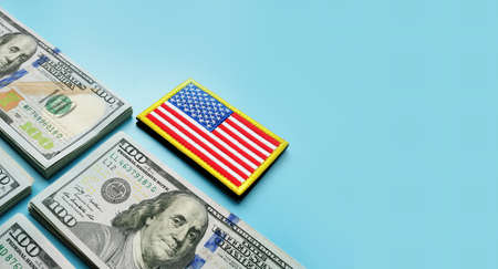 American dollars banknotes on the flag of United States of America. US dollars background. 100 USD