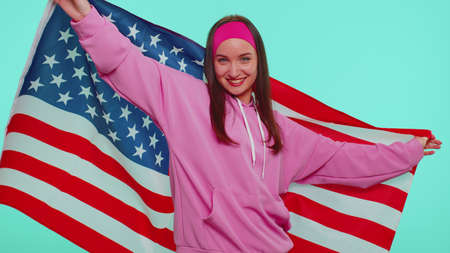 Trendy cheerful positive teen girl waving and wrapping in American USA flag, celebrating, human rights and freedoms. Independence day. Young pretty adult woman. Indoor studio shot on blue background