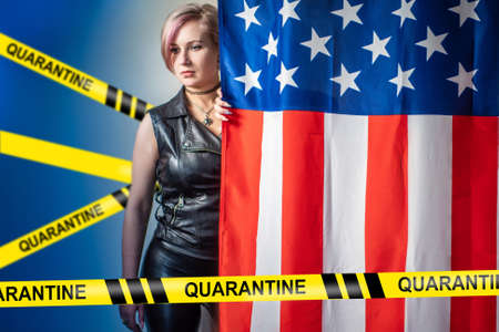 The girl stands next to the US flag in the middle of the restraining tapes with the inscription Quarantine. Restrictions due to coronavirus infection in America. Covid-19 quarantine.
