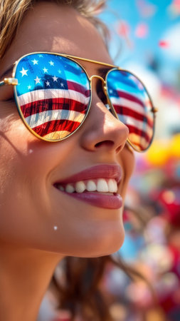 Close-up of a woman's face wearing sunglasses with the flag of the United States of America