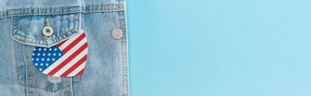 panoramic shot of paper cut heart made of american flag on denim stylish jacket on blue background