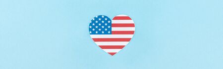 top view of paper cut decorative heart made of american flag on blue background, panoramic shot