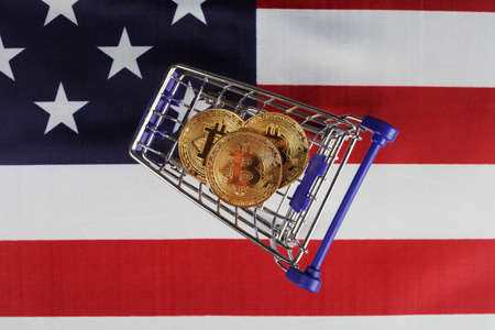 USA Flag with Bitcoin flat lay for illustration. Cryptocurrency btc law concept.