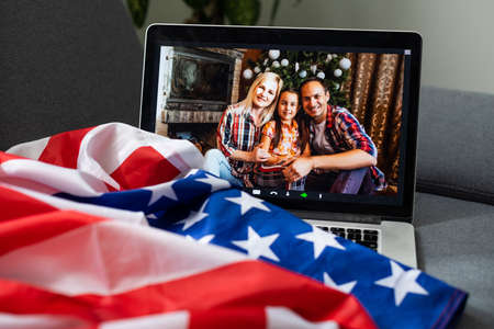 Online party with loved ones from USA. Celebrating Christmas video chat. Virtual party via video messenger. Americans new year are video chatting. New Year gifts and flag of America next to computer