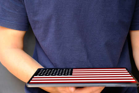 Happy hipster man holding American or USA flag. He is wearing casual clothes.
