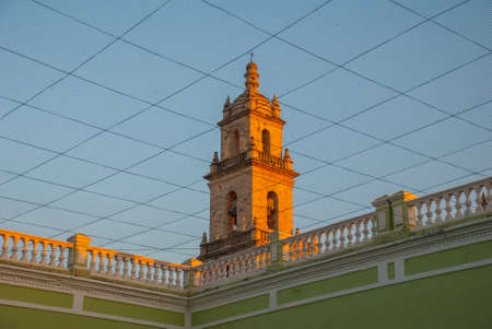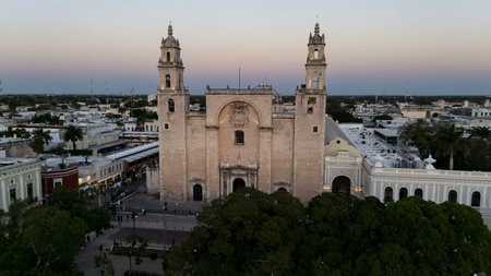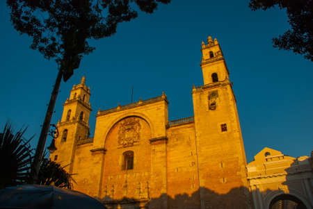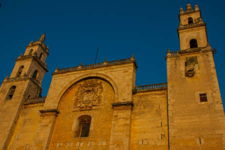 Evening View to the Main Entrance of the Merida Cathedral on Yucatan, which is built on Mayan ruins, Mexico