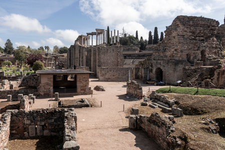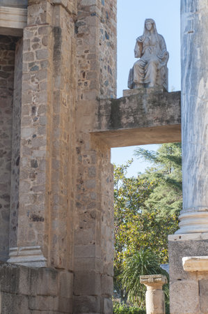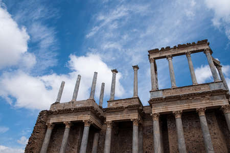 Richly decorated Corinthian-style marble columns and architrave on the Roman Theater in sunny day at Merida. Founded by ancient Rome in western Spain, the city preserves many buildings of that era.