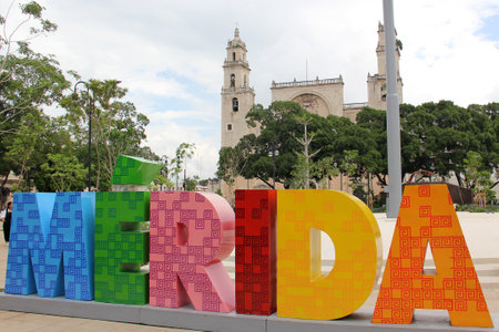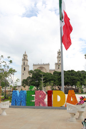 MERIDA, MEXICO - FEBRUARY 21: Colorful Merida sign with a Mexican flag and cathedral in the background in Merida, Mexico on February 21, 2017