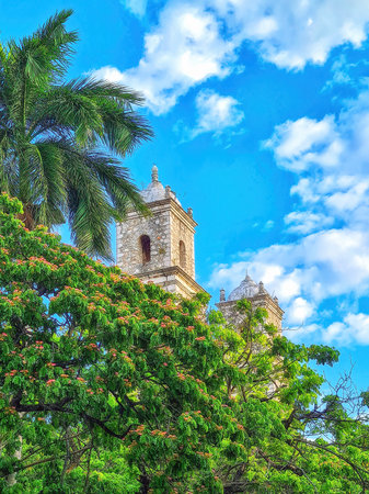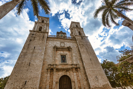 San gervasio cathedral, a colonial-era landmark, stands tall against a backdrop of palm trees and a cloudy sky in valladolid, mexico