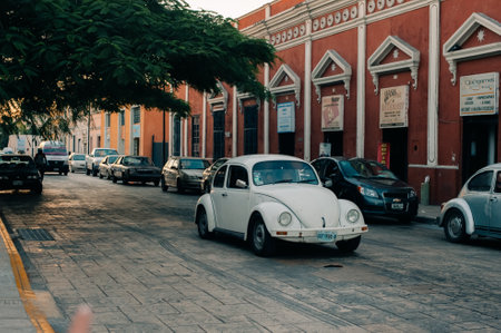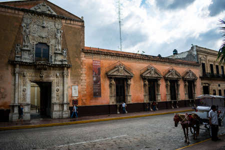 Merida, Yucatan, Mexico - 4 April, 2022: Old street of Merida downtown, colonial style building at sunset