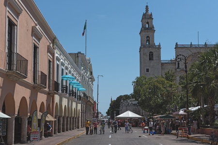 View along the colonial buildings with Mexican flag and birds flying to the tower of the cathedral of Merida, Yucatan, Mexico