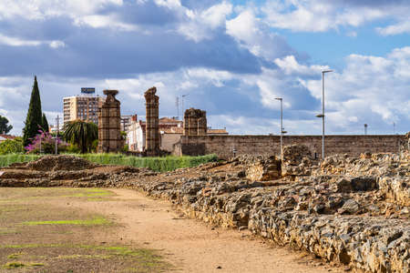 View of the archaeological remains of the Roman theater in Mérida, Extremadura, Spain