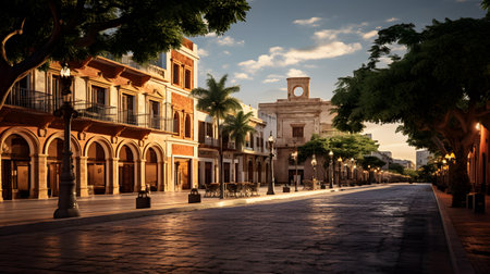 Merida, Yucatan, Mexico - April 4, 2024 Old street of Merida downtown, colonial style building at sunset. High quality photo