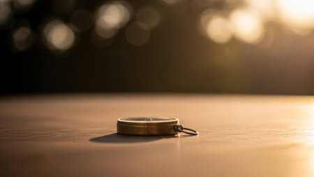 Sunlight showing close up of a brass compass resting on a wooden surface with soft bokeh background and warm...