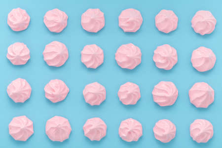 sweet meringue kiss cookies over blue background, flat lay, top view