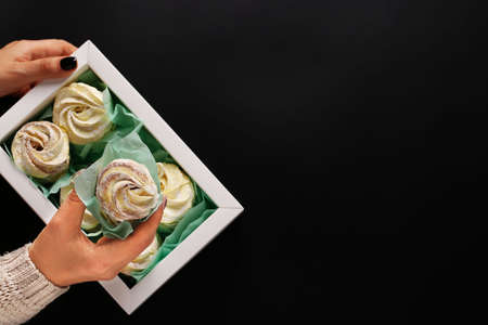 Box with homemade marshmallows in female hands on a dark background, horizontal orientation, Top view, Copy space