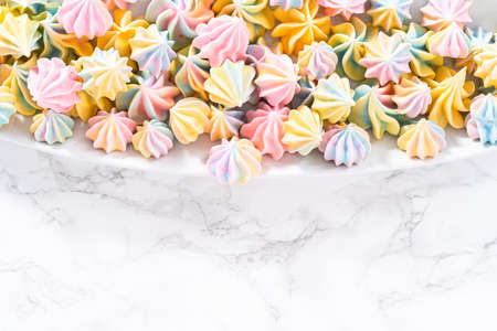 Sweet meringue cookies arranged in semi-circle. Pastel colors. Minimal concept flat lay.