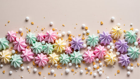 Sweet, pastel-colored meringues sparkle on a soft background, creating delight.