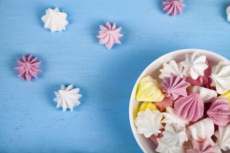 Homemade sweet colored meringue from eggs and sugar on blue background. Dessert.