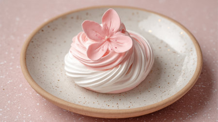 A beautifully crafted meringue dessert sits on a speckled plate. The dessert is decorated with a pink flower and placed against a soft pink background, creating an inviting atmosphere.