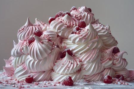 A decadent cake covered in white frosting and adorned with fresh raspberries on top, A sculptural pile of fluffy, raspberry-studded meringues