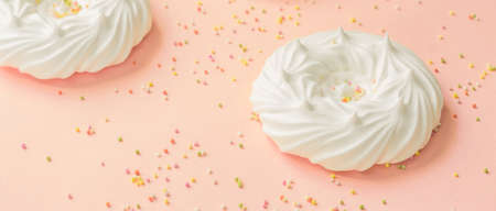 Colored small meringues on a pink background. Flat lay concept. Copy space