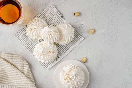 meringue and tea on white background. meringue is a dessert made of whipped egg whites with sugar. Flat lay and copyspace