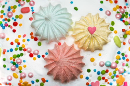 marshmallows against a background of multicolored meringues closeup. Confectionery zephyr and meringue