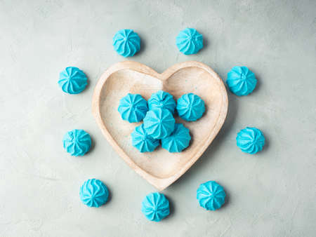 Heart shaped wooden dish with blue sweet meringues, flat lay